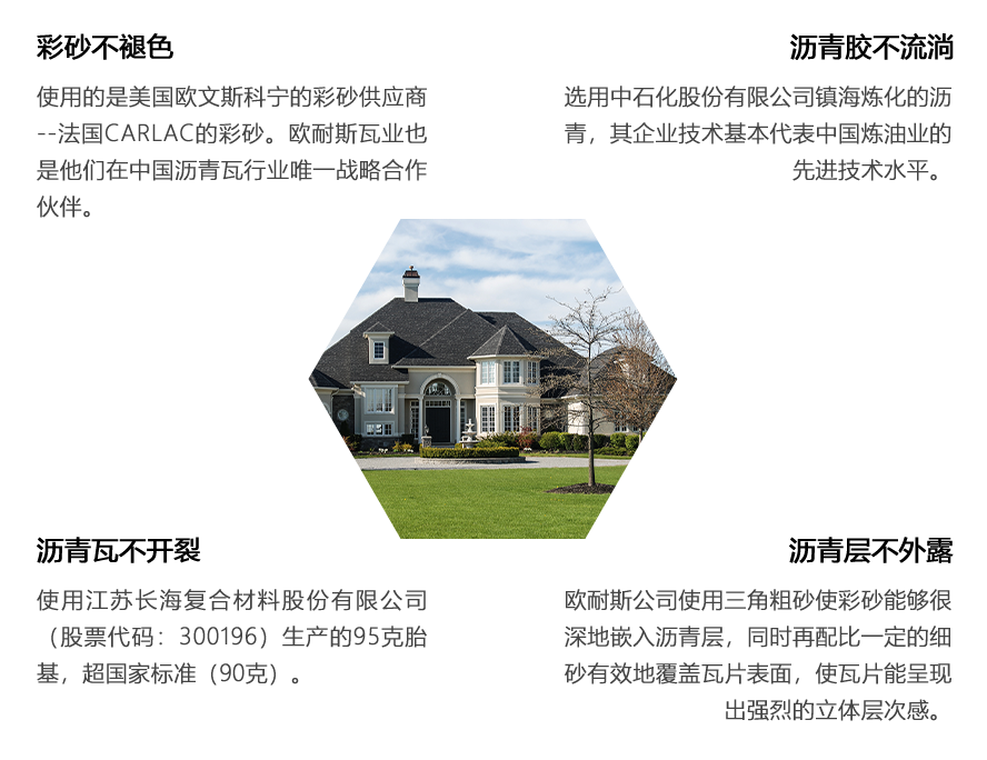 • 彩砂不褪色使用的是美國歐文斯科寧的彩砂供應商--法國CARLAC的彩砂。歐耐斯瓦業也是他們在中國瀝青瓦行業唯一戰略合作伙伴。CARLAC的彩砂經過800度以上的高溫燒結而成,顏色鮮艷穩定,不易褪色。